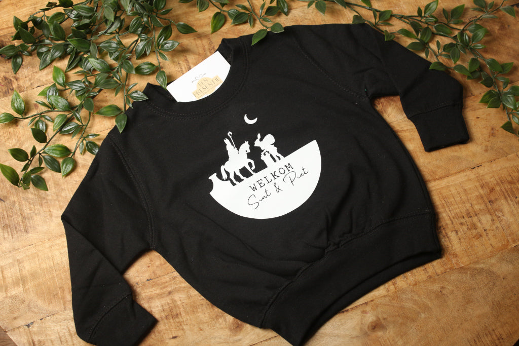 Geef je kindje een warme en feestelijke look met deze gezellige trui bedrukt met "Welkom Sint & Piet". Perfect om aan te trekken tijdens pakjesavond, naar school of tijdens een Sinterklaasfeestje. Deze trui is niet alleen stijlvol en comfortabel, maar kan ook helemaal gepersonaliseerd worden met de naam van je kind en een afbeelding naar keuze. Zo maak je er een uniek kledingstuk van dat echt opvalt!