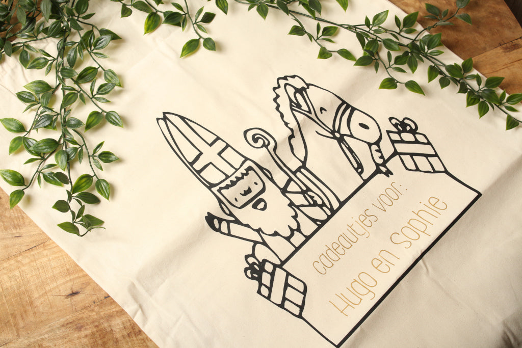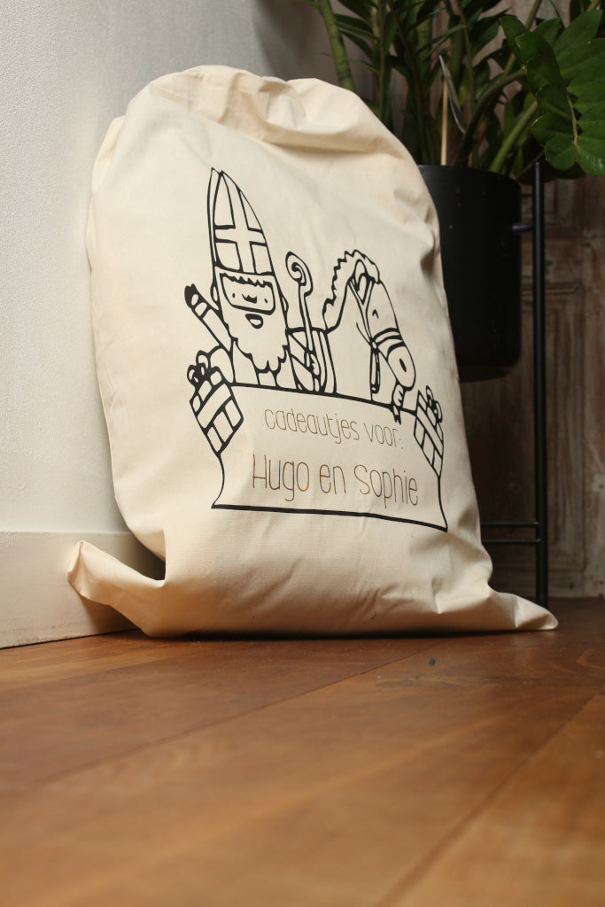 De katoenen zak is stevig, duurzaam en kan jaar na jaar opnieuw gebruikt worden. Bovendien kun je de zak laten personaliseren met een naam of afbeelding, zodat iedereen precies weet van wie de cadeautjes zijn. Dat maakt het niet alleen handig, maar ook extra speciaal en uniek.